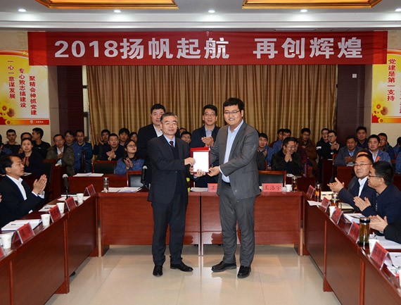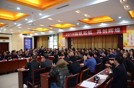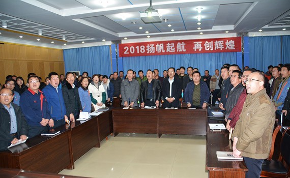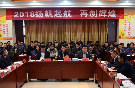 大会的主题是:2018扬帆起航 再创绚烂,集团公司总裁谢永生主持大会。
