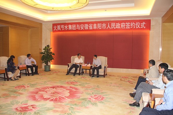 ▲阜阳市副市长刘树生与6t体育节水集团公司党委书记王冲亲热谈判